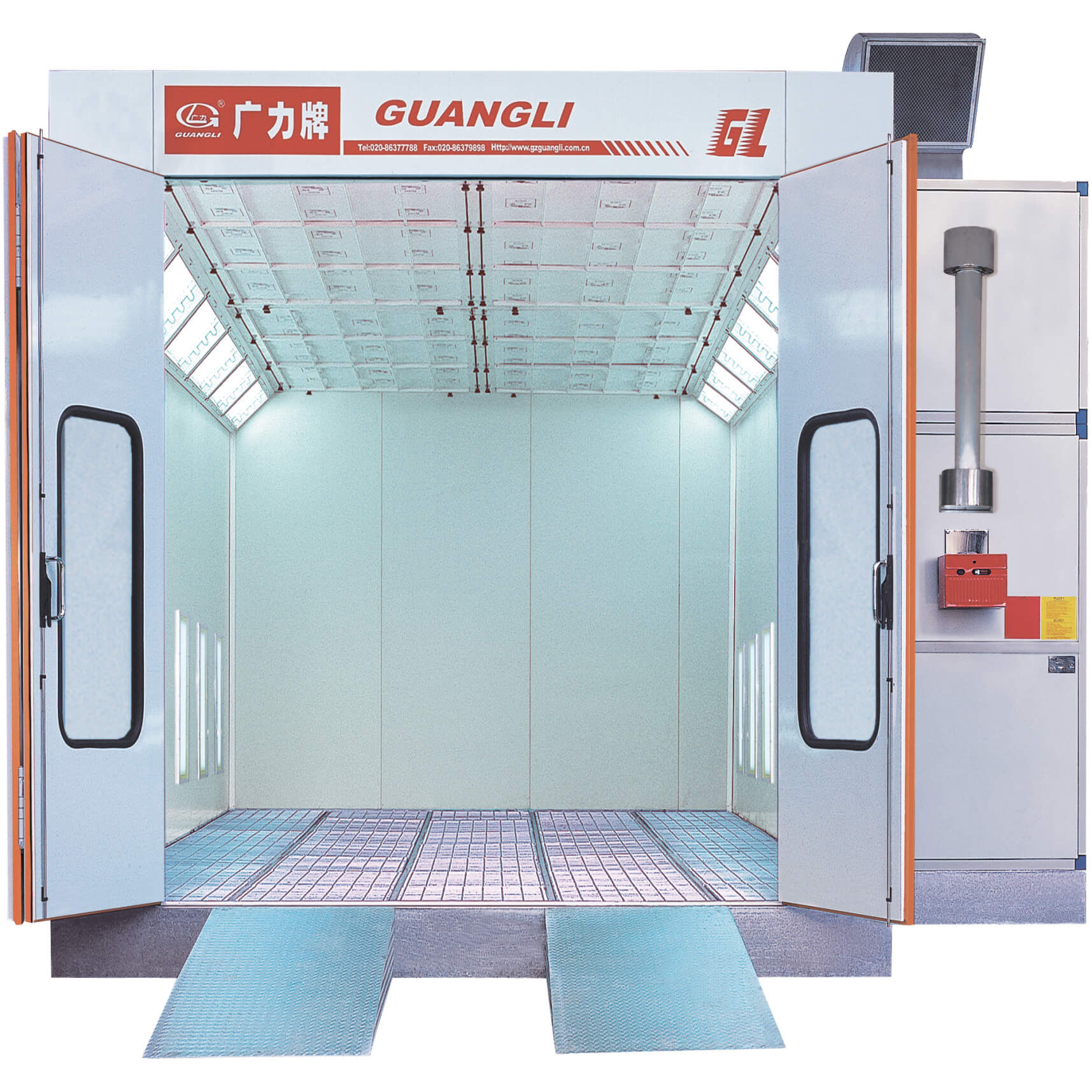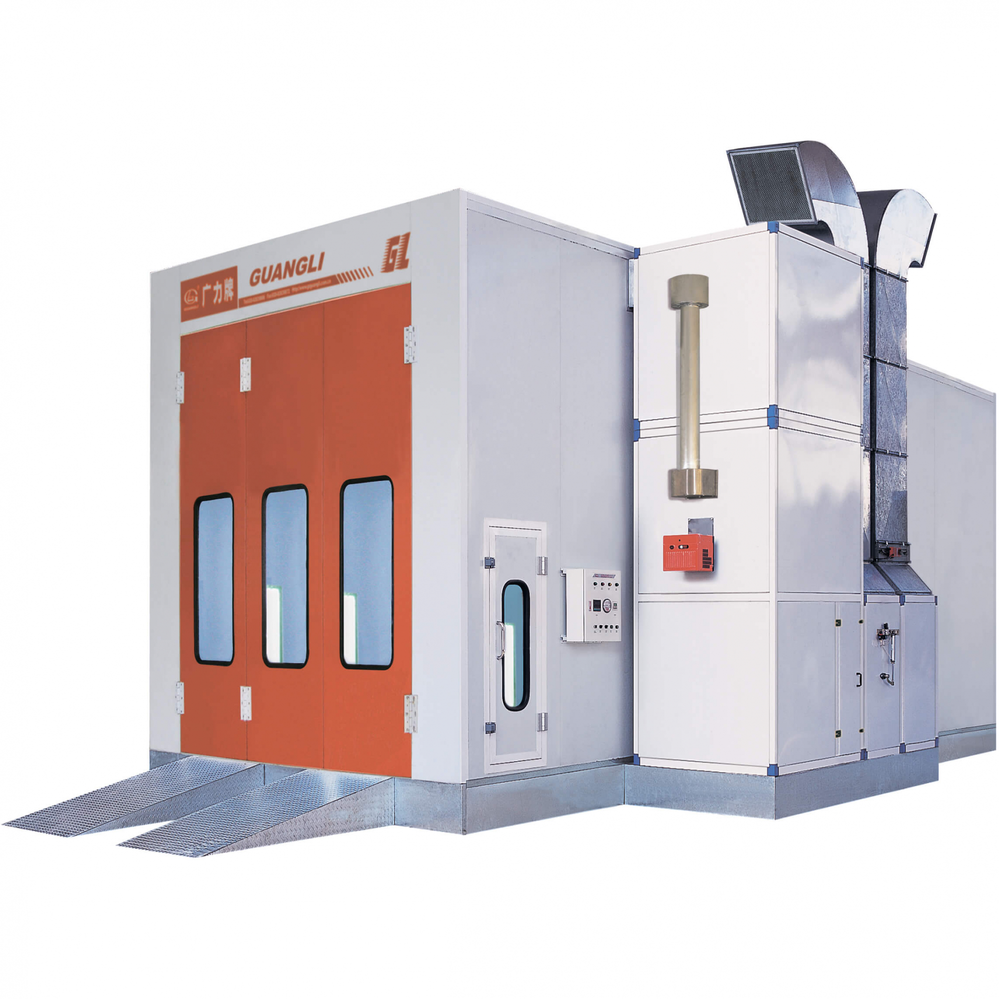 Окрасочно-сушильная камера Guangli GL9 имеет в своей основе металлическое основание высотой 30 см. Напольные решётки (цельные) выдерживает нагрузку до 600 кг на одно колесо. В стандартном исполнении камера Guangli GL9 комплектуется дизельной горелкой из нержавеющей стали Riello G20S итальянского производства. Мощность горелки составляет 200 кВт, 90 % нагретого воздуха подвергается рециркуляции. Корпус Guangli GL9 собирается из сэндвич-панелей толщиной 50 мм, в качестве наполнителя используется пенополистирол. Опционально можно в качестве наполнителя можно использовать минеральную вату. Фронтальная дверь камеры состоит из 3-х створок, аварийная дверь находится сбоку камеры, она оборудована пневматическим затвором.