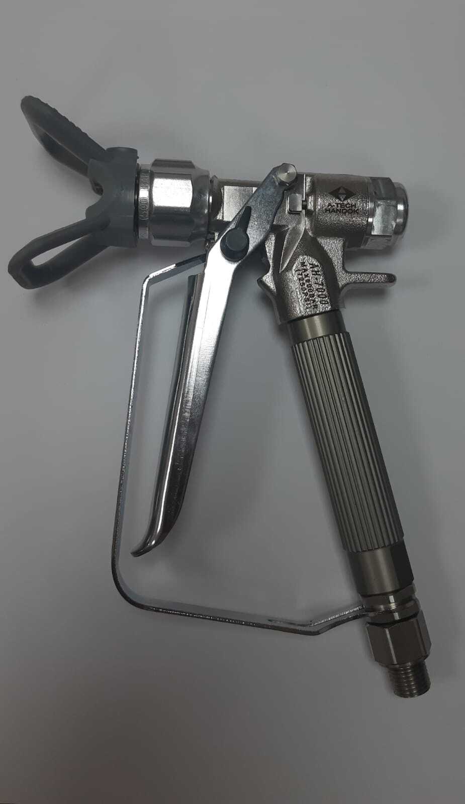 Краскораспылитель корейского производителя Handok АН-7000 может использоваться с любыми безвоздушными окрасочными аппаратами высокого давления до 500бар. Является аналогом пистолета Graco XTR-5. Резьба под соплодержатель - 7/8", соплодержателем не комплектуется. Присоединительная резьба для окраосчного рукава 1/4".