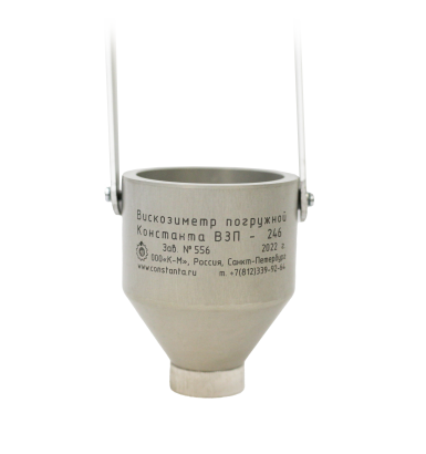 Вискозиметр представляет собой выполненный из алюминиевого сплава резервуар цилиндрической формы, переходящий внизу в полый конус со съемным соплом из нержавеющей стали. К резервуару прикреплена ручка для удобства работы.